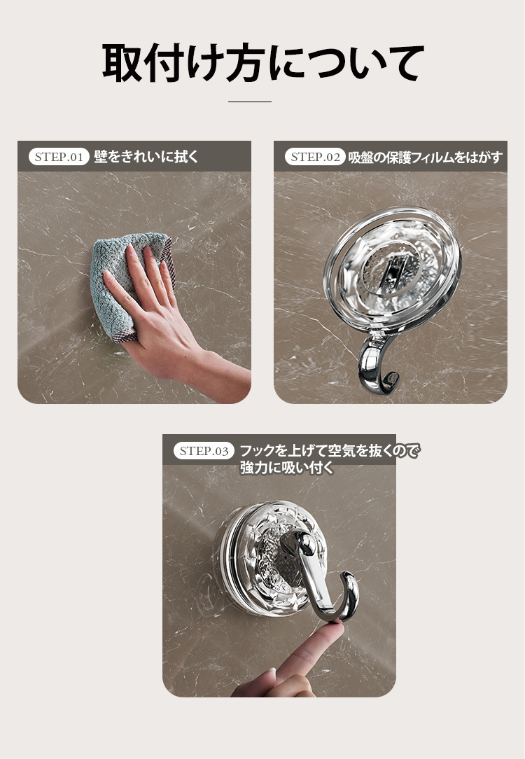 工具不要で簡単に取り付け可能な吸盤フック